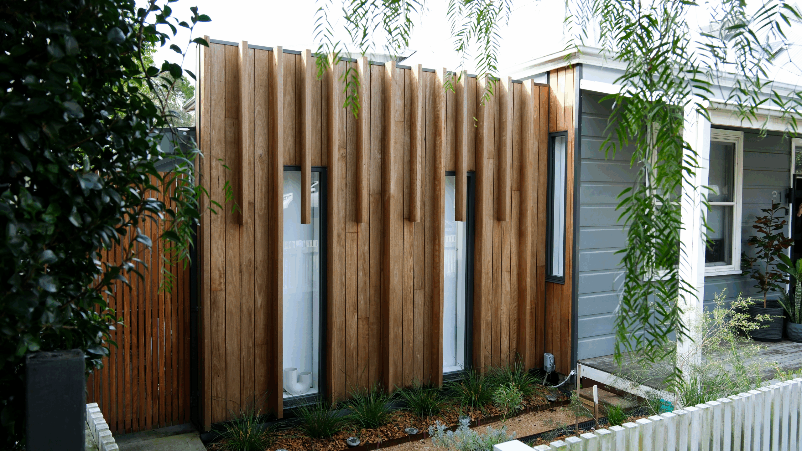 This transformation included converting an old laundry and storage shed into stylish living room and study, complete with polished concrete flooring and a blackbutt cladding façade.